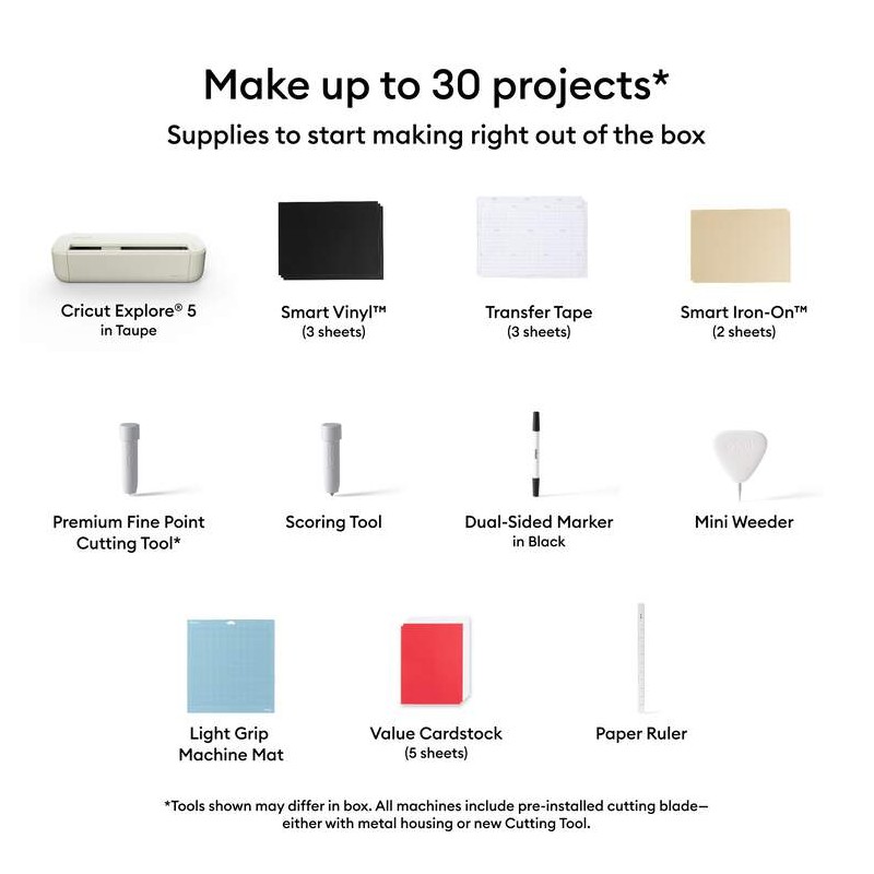 Cricut Explore 5 comes with must-have crafting tools and an assortment of popular materials, so you can make up to 30 projects right out of the box.²
