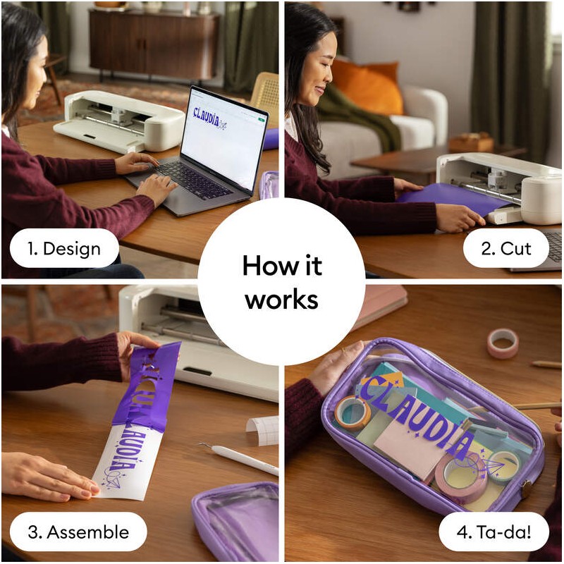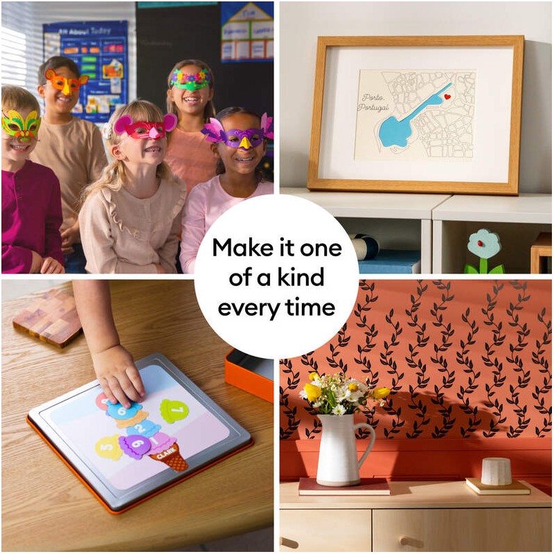 The next generation of our 12-inch cutting machine precision-cuts at top-tier speeds and works with over 100 materials¹ to help you create custom decals, personalized apparel, full-color stickers, cards, and so much more. You can even make in multiples!